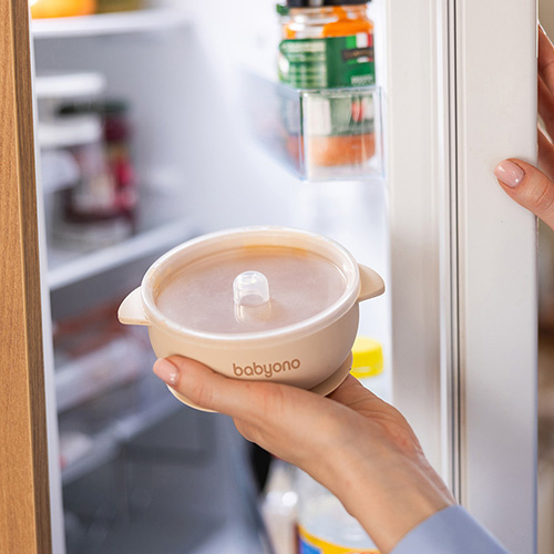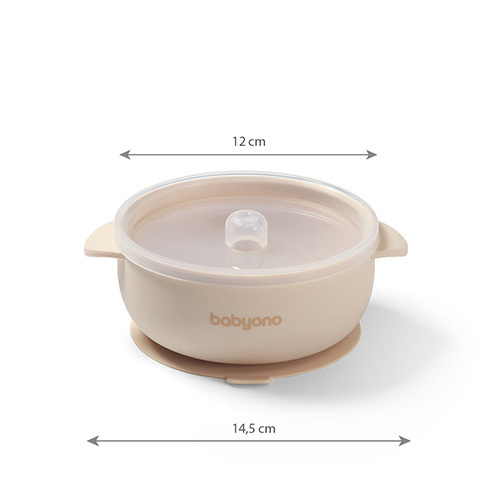 Želite v prehrano svojega malčka vpeljati nove okuse? Silikonska posodica Babyono s priseskom in pokrovom bo olajšala širjenje prehrane vašega dojenčka in mu pomagala pri učenju samostojnega hranjenja. Uporabite jo lahko za serviranje juh, testenin, zelenjave, sadja in jogurta. Zahvaljujoč močnemu prisesku silikonska otroška posodica ostane na mestu, tudi če firbčne roke poskušajo posodo prevrniti. Zaobljena oblika omogoča vašemu malčku, da si sam postreže hrano. Pokrov ohranja hrano svežo in toplo, nedrseči ročaji pa olajšajo prenašanje. Naša posodica za hranjenje s priseskom je izdelana iz varnega, brez BPA ter trpežnega silikona. Primerna je za uporabo v mikrovalovni pečici in v pomivalnem stroju.