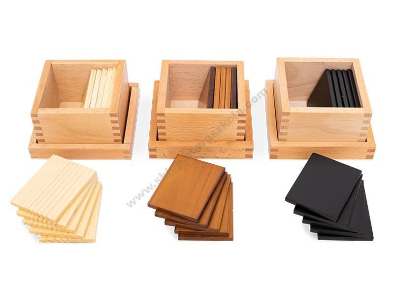 Komplet 3 škatel s pokrovi, v vsaki škatli je 10 lesenih desk. Seti desk so v različnih barvah, razlikujejo pa se tudi po teži. Barva desk nakazuje njihovo težo. Temno – težko, svetlejše – lažje, najsvetlejše – najlažje. Z uporabo teh desk otroci ne razvijajo samo koncentracije in mišično-motorične koordinacije, ampak tudi pridobijo in izpopolnijo sposobnost razlikovanja teže z rokami. Seznanijo se tudi s pojmi, povezanimi s pojmom teže: težak – lahek, stopnjevanje teh izrazov, težji od …, lažji od … 30 elementov v 3 škatlah: dim. plošče: 6 x 0,5 x 8 cm; dim. škatle: 13 x 13 x 7 cm; material: les; starost: 3+