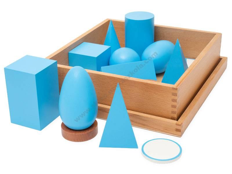 Ta komplet teles uvaja otroke v svet geometrije tako, da jih uči sestavljanja ravnih in prostorskih likov – osnove in stene. Z rokovanjem s predmeti, razločevanjem in poimenovanjem geometrijskih likov razvijajo čut za vid in tip. V kompletu so stojala za lažje delo z zaobljenimi telesi. Vsi elementi seta so shranjeni v škatli s pokrovom. 18 elementov: pravilna geometrijska telesa: kocka, kvader, prizma, piramida s trikotno osnovo, piramida s kvadratno osnovo, stožec, valj, krogla, elipsoid, ovid (jajce); ploščate figure: krog, kvadrat, pravokotnik, enakostranični trikotnik, enakokraki trikotnik; 3 stojala; dim. škatle: 30 x 28 x 8 cm; material: les, starost: 3+