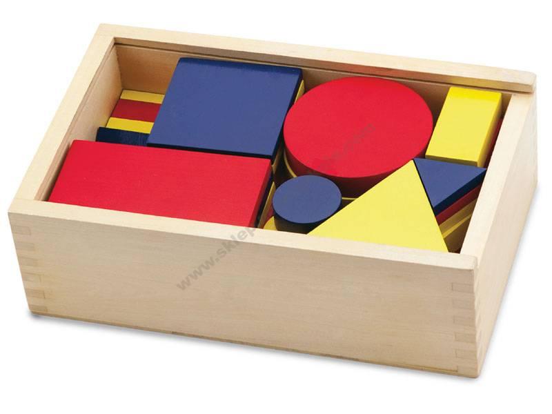 Lesene kocke v osnovnih geometrijskih oblikah; 48 elementov: trikotnik, kvadrat, pravokotnik in krog v rdeči, rumeni in modri barvi; lesena škatla 25 x 15,5 x 8 cm; material: les; starosti 3+