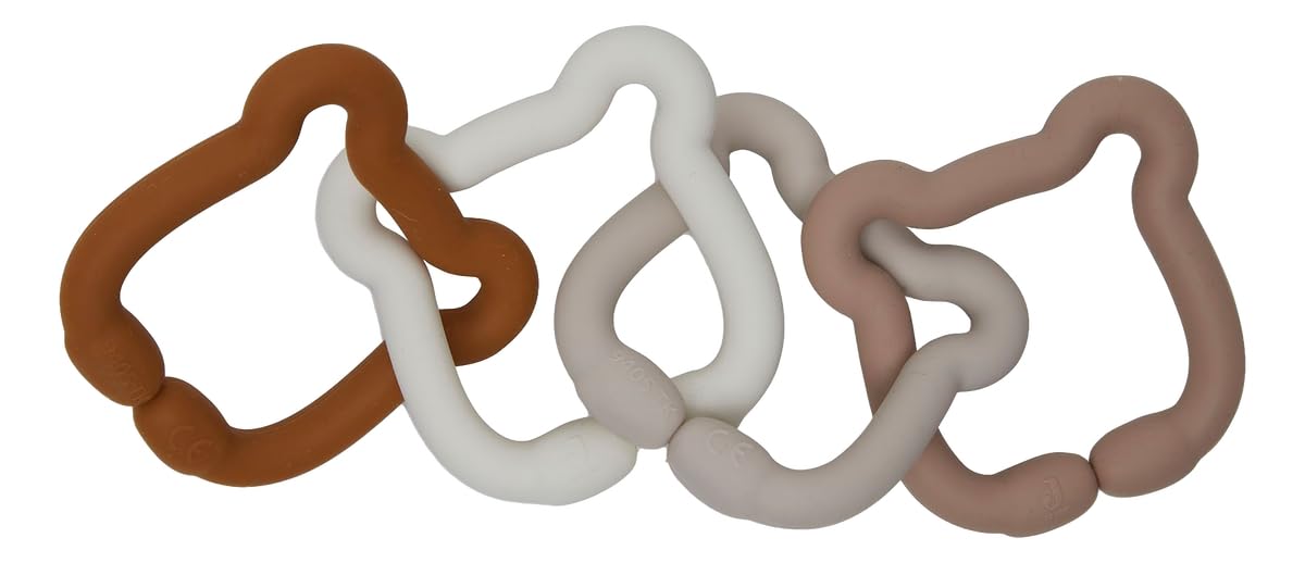 Ti zabavni silikonski predmeti so popolni za uporabo kot igrače, vendar so tudi praktični, ko vašemu malčku izraščajo zobke. Prava igrača 2 v 1! Vsi silikonski predmeti so izdelani iz 100% silikonskih predmetov in ne vsebujejo BPA in PVC, zato so popolnoma varni za vašega otroka! Prav tako so odlična darila za rojstvo otroka. Ta kolekcija ponuja silikonsko žogico, obročke za igrače in različne zobne obročke ter še več.Ta ljubek obroček za zobke je v barvah Nougat, Biscuit, Off-white in Caramel.Ta zobni obroček je narejen iz 100% silicija.Medvedki so veliki 7×7 cm. V kompletu so 4 medvedki.