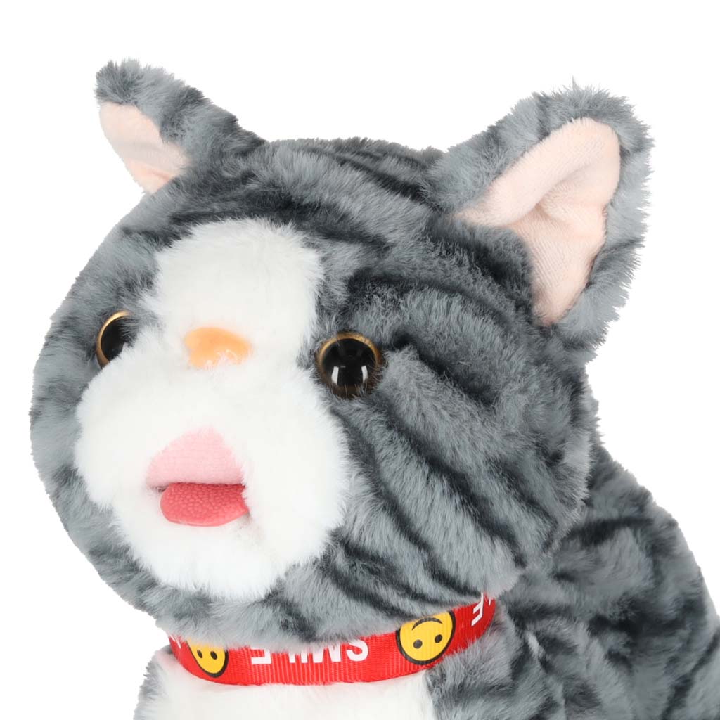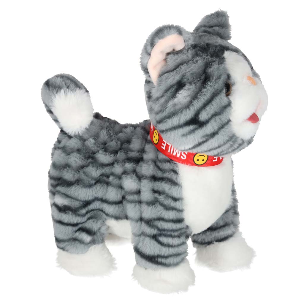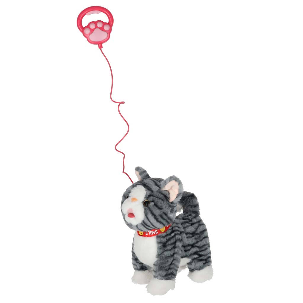 - prijazna mačka z vključenim povodcem – siv kožušček je prijeten na dotik in spodbuja božanje Lahko ga božate – ko ga božate po glavi, bo maček mijavkal ter premikal rep in jezik Maček hodi naprej in igra pesmice – ko pritisnete gumb na povodcu, začne maček hoditi naprej, pri tem pa igra vesele melodije Prijazna igrača za otroke od 3. leta dalje – plišasta muca z povodcem bo vašemu otroku pokazala, kako skrbeti za hišnega ljubljenčka Otroku lahko podarite kot darilo – mucka v pisani škatli bo zagotovo navdušila najmlajše