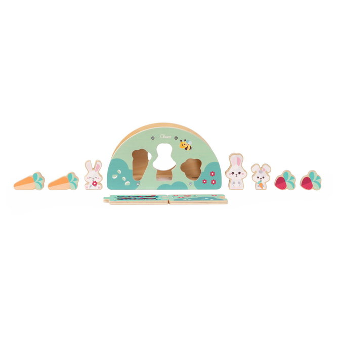 - Vsebina paketa: 1 lesena igrača za sortiranje, 3 figurice zajčkov, 2 korenčka, 2 pesa, 2 kos`a poti