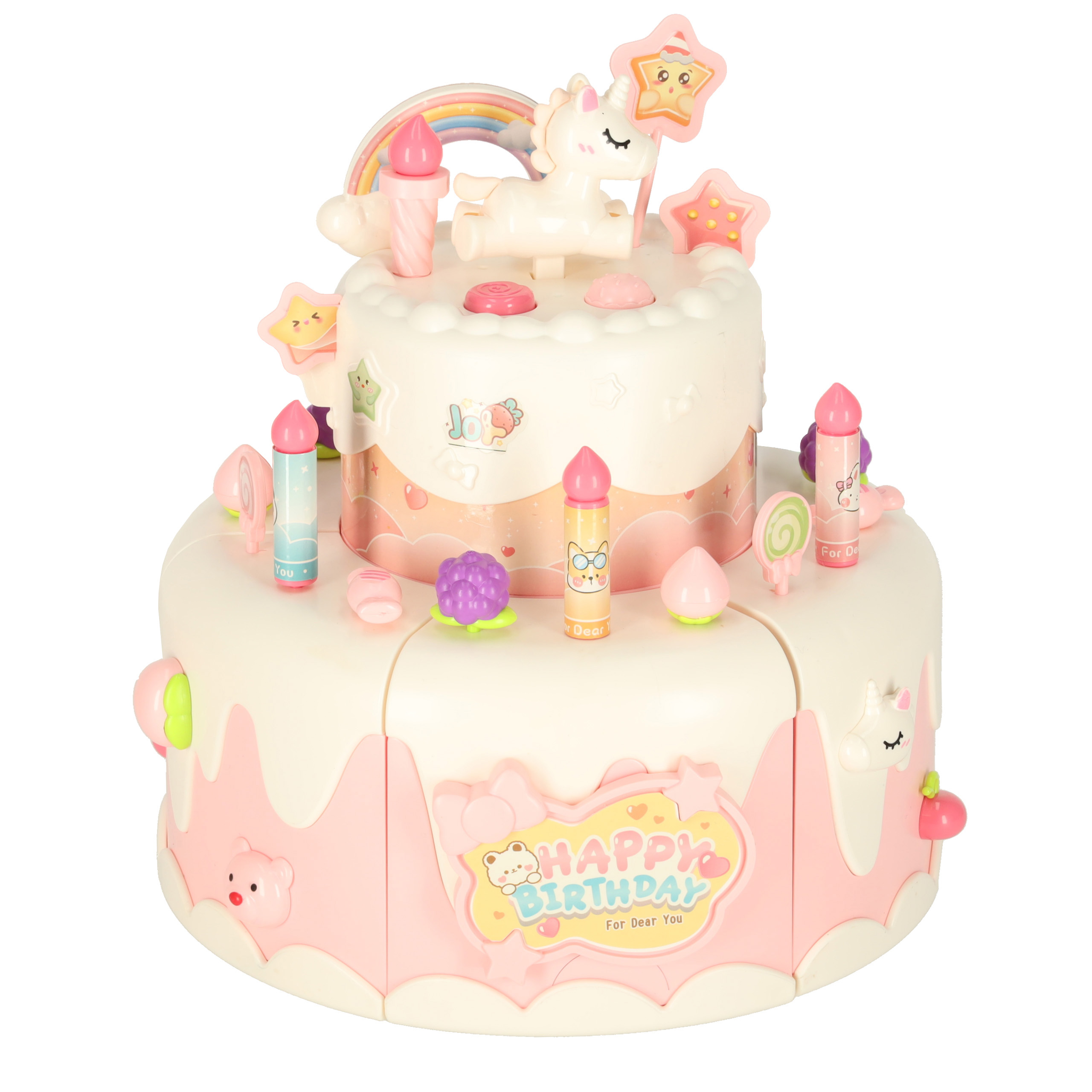 - vrsta igrače: torta za igrače (16 elementov) starost: 3+ material: plastika barva: roza, bela napajanje: 3 x baterije AA (niso priložene) premični elementi: da – snemljivi deli torte, pritrjeni na velcro, snemljive sladkarije (lahko se namestijo svečke) in zamenljive figure interaktivni elementi: da – torta se vrti in predvaja glasbo