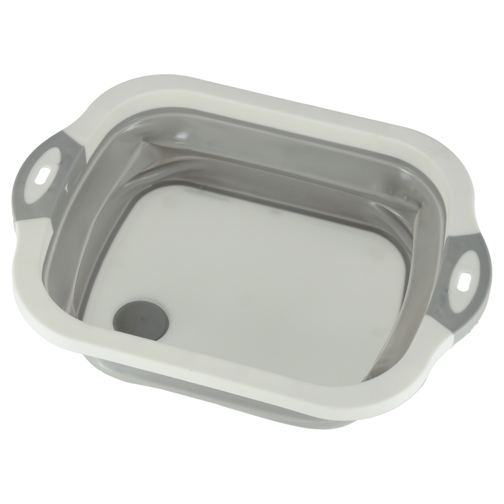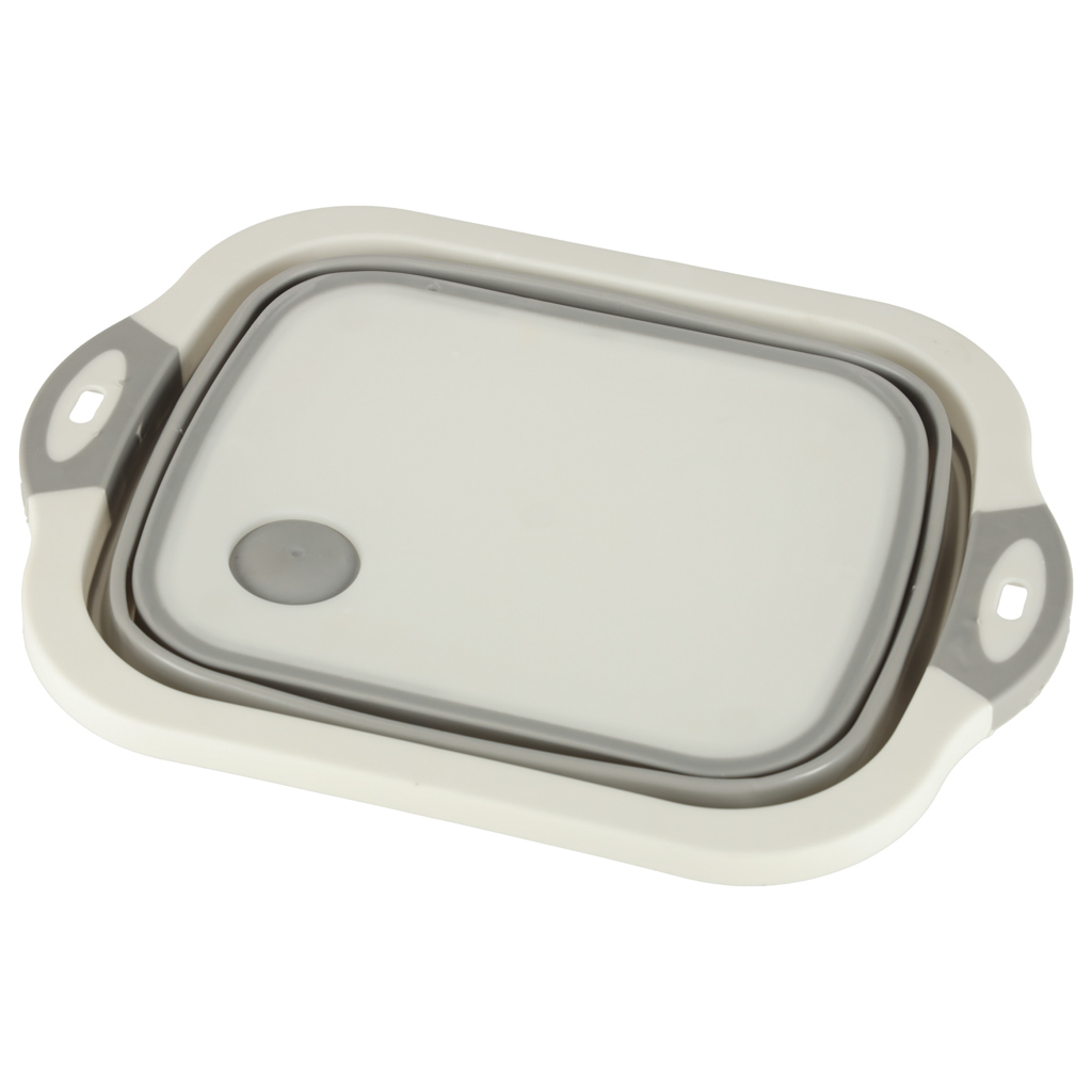 Zložljiva silikonska posoda 5,5 L, 4 v 1: posoda, deska za rezanje (25,5 × 20 cm), odcejalnik z zamaškom, potovalno korito. Zložljiva oblika (37 × 27 × 2,5 cm) prihrani prostor. Silikon, ki je odporen na deformacije in varen za živila.