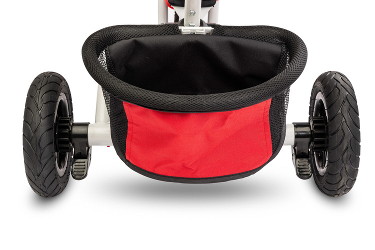 odklopljiv zaščitni lok, košara na zadnji strani za igrače in dodatke, volan z nastavljivo višino, penasta kolesa. Obe zadnji kolesi imata ločene zavore. Zložljiva konstrukcija omogoča enostaven transport v prtljažniku.