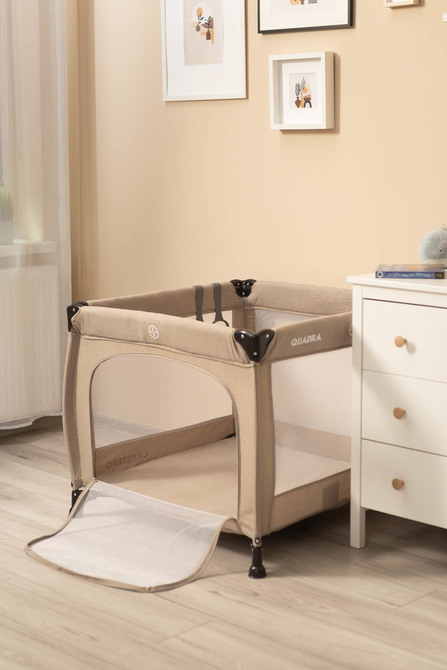 Quadra je lahka in praktična kvadratna varovalka. Izdelana je iz tkanine in visokokakovostne plastike, kar zagotavlja njeno trajnost. Opremljena je z blazino, zadrgami na vratih in ročaji za učenje vstajanja. Quadra je popolna kot prostor za igro in sprostitev doma ali na potovanju. Enostavno zlaganje in priročna torba omogočata lažje prenašanje varovalke.