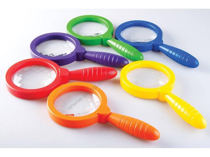Komplet trpežnih povečevalnih stekel za odkrivanje sveta v novi perspektivi. Visokokakovostna stekla s kalejdoskopskim učinkom zagotavljajo odlične vizualne občutke. Opremljene so z velikimi ročaji, primernimi za male ročice ali osebe s posebnimi potrebami. Specifikacija izdelka: 6 kosov. okvir v 6 barvah starost: 18 mesecev +