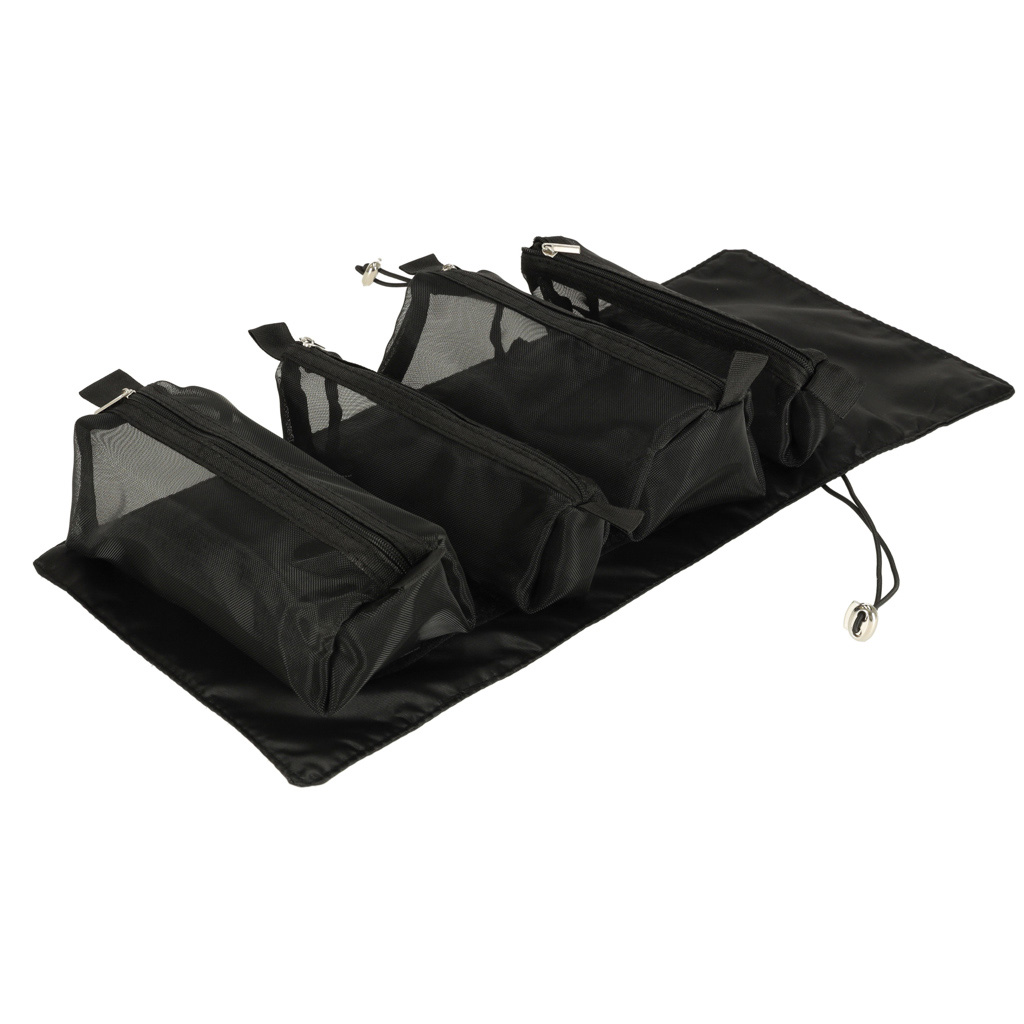 Črna potovalna kozmetična torbica. Lahko jo zvijete, da vam v prtljagi zavzame manj prostora. Ima štiri predale, ki jih je mogoče odstraniti. Stene iz mrežice olajšajo iskanje kozmetičnih izdelkov. Dolžina: 53 cm. Material: poliester.